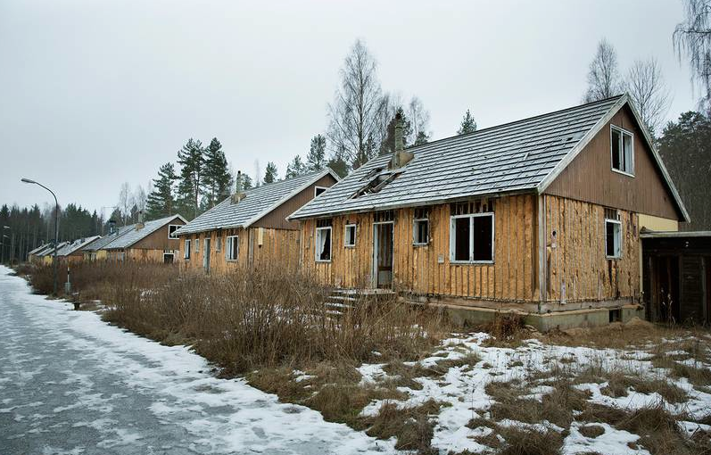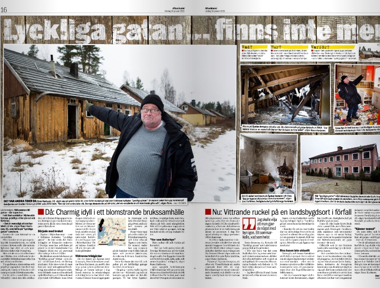 Sen blev det lågkonjunktur och fabriken började hacka. Folk fick sparken, den lokala mataffären tvingades stänga. Idag bor det bara cirka tjugo personer kvar i Björnhammar, och fabriken stängde i fjol. De tio husen på Ågatan gapar tomma sedan flera år tillbaka; fasaden har lossnat, glasrutorna har krossats. Att besöka Ågatan – som i folkmun kallades “Lyckliga gatan” när det begav sig – är att besöka en spökgata, ett gravmonument över det folkhem som en gång var.