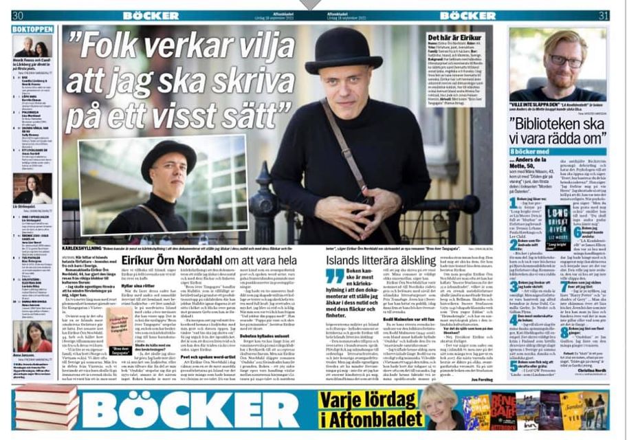 Har intervjuat en hel del författare för Aftonbladet på sistone vilket är kul. Daniel Åberg skriver snabb spänning direkt för ljud, Sofia Nyblom har rotat i sin farfars förflutna på ett österrikiskt kloster och idag kan man läsa mitt möte med en två meter lång man i plommonstop som är Islands hetaste skribent sen Sturlasson.