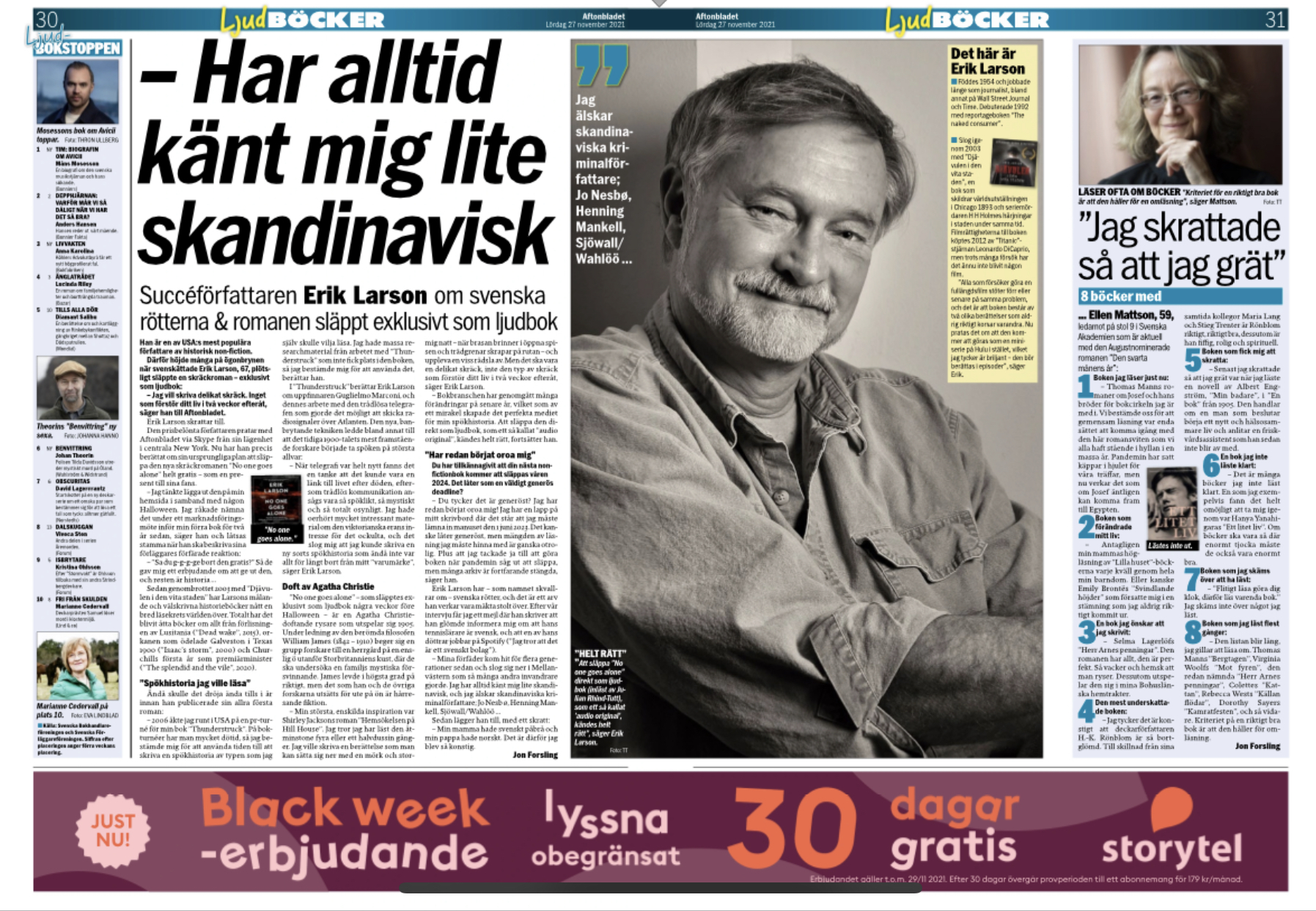 Det svenskklingande namnet till trots är Larson en av USA:s mest hyllade författare av historisk non-fiction, och har skrivit böcker om allt från förlisningen av Lusitania (”Dead Wake”, 2015), orkanen som ödelade Galveston i Texas 1900 (”Isaac’s Storm”, 2000) och Churchills första år som premiärminister (”The Splendid and the Vile”, 2020). Men det dröjde ända till i år innan han släppte sin första skönlitterära roman, den Agatha Christie-doftande skräckisen “Noone goes alone” som utspelar sig 1905 och släpptes exklusivt som ljudbok i höstas.