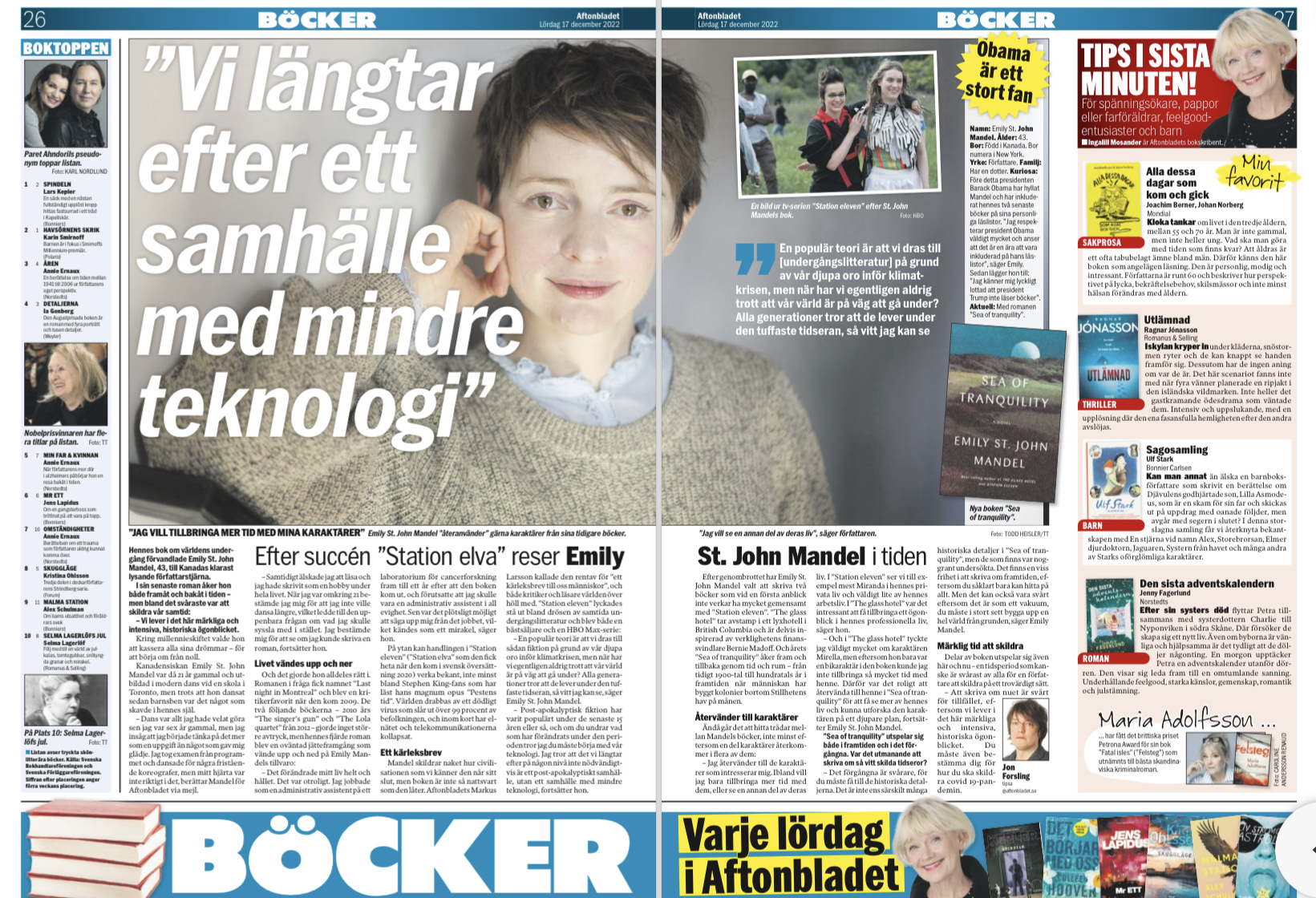 I dagens Aftonbladet har jag intervjuat Kanadas just nu hetaste författare, Emily St. John Mandel. Hon slog igenom stort med den postapokalyptiska romanen “Station Eleven” 2014, och är just nu aktuell med en hisnande resa i tid och rum i form av boken “Sea of tranquility”. Tycker hon bidrog med många intressanta tankar, bland annat detta citat som svar på frågan varför vi är så fascinerade att läsa dystopiska framtidsvisioner av en värld som till stora delar har förstörts: