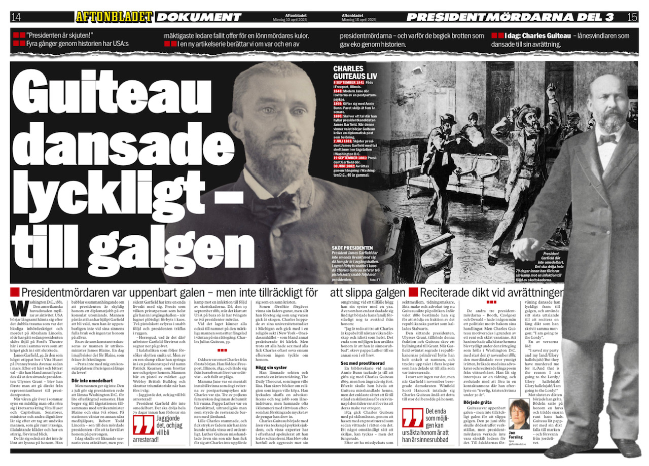 Jag älskar att skriva om USA, historia och true crime – gärna på samma gång. Just nu rullar artikelserien “Presidentmördarna” i Aftonbladet, där jag berättar om var och en av de fyra män som lönnmördat amerikanska presidenter genom åren. Booth och Oswald känner många till, men Leon Czolgosz och Charles Guiteau var två sjuka människor med fascinerande livsöden som är så gott som bortglömda idag.